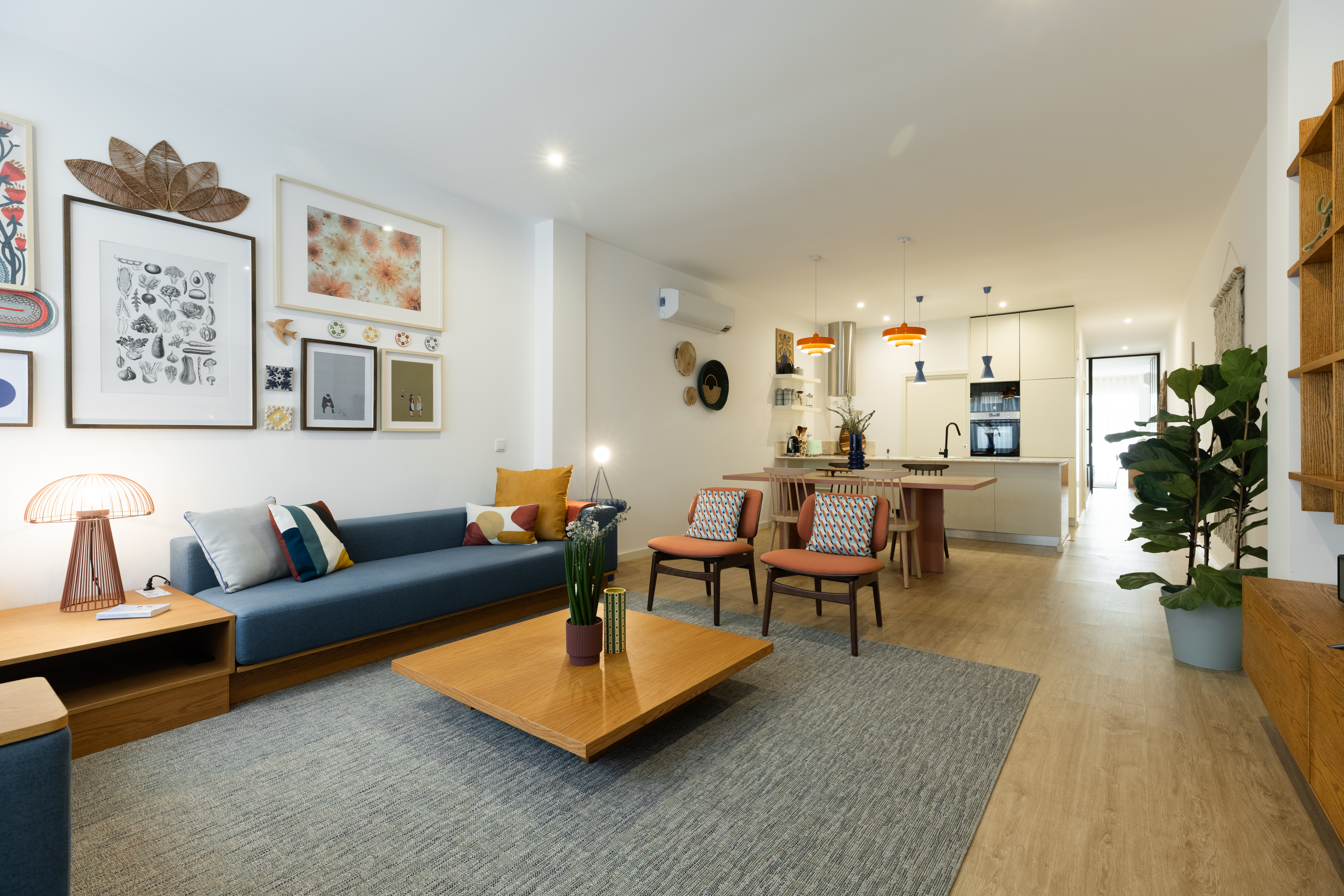 A paleta foi construída a partir de tons que a cliente aprecia, laranja, rosa e verde, aplicados sobretudo no mobiliário e nos elementos decorativos. A mesa de jantar em rosa empoeirado, os candeeiros num laranja vibrante e o sofá num azul hipnotizante foram pensados para apresentar um aspecto robusto, resistente e “blocky”, com uma presença firmemente assumida no espaço.