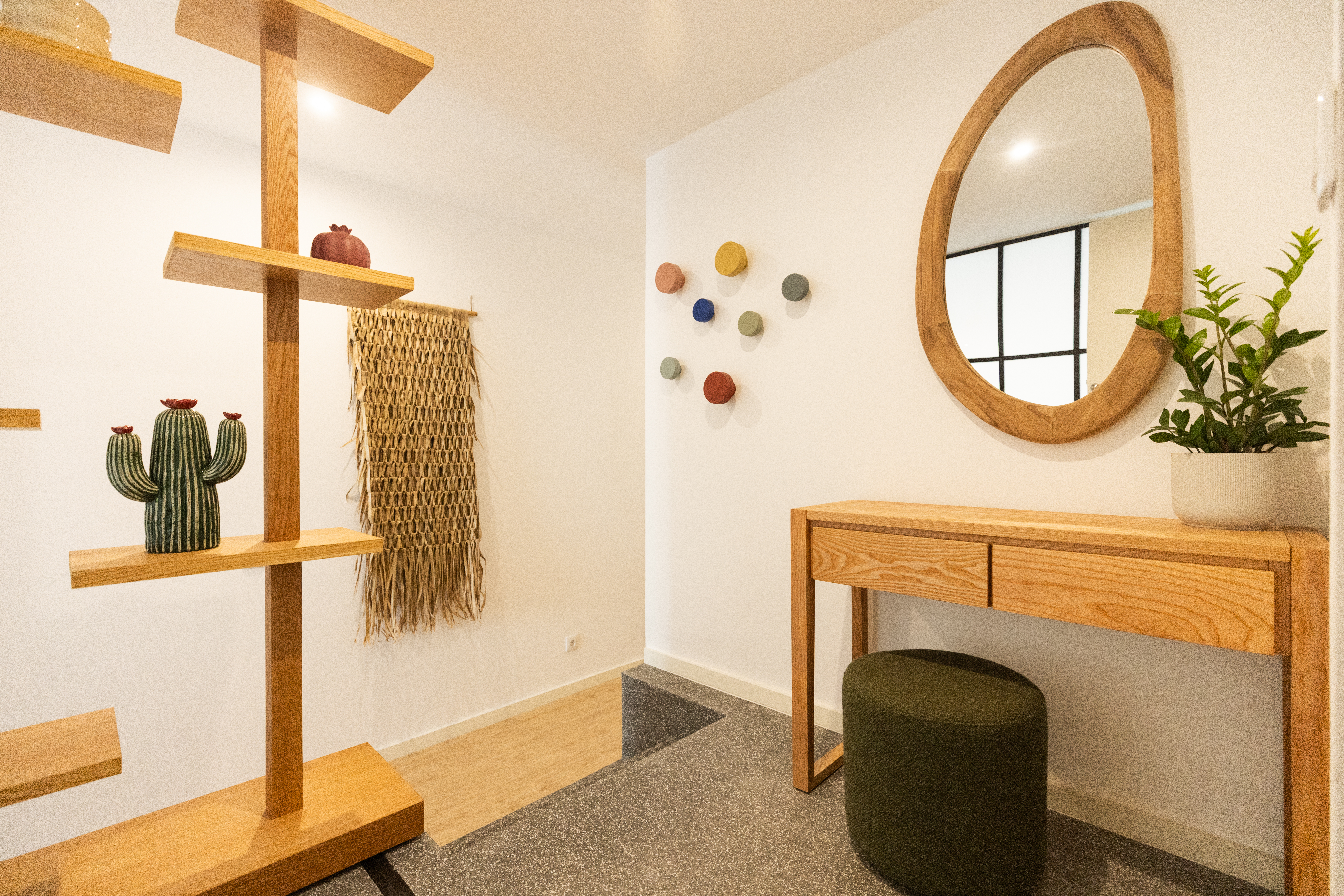Foram desenhadas algumas peças de mobiliário sempre com a ideia de jogo de formas em mente. As estantes, que surgem em diversos espaços da casa, refletem essa intenção. Somos confrontados com esse gesto logo à entrada: um biombo, uma divisória que se apresenta como uma brincadeira de níveis e plataformas, antecipando o diálogo entre formas que se desenrola no resto da casa.