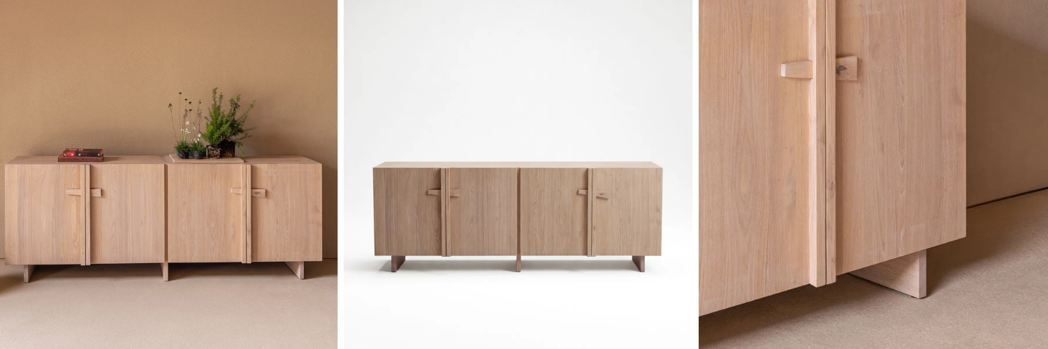 O aparador Terra foi inspirado num armário Koji, um tipo de armário, ligado aos processos de fermentação japoneses, que levam tempo e cuidado. Fabricado em madeira maciça de Castanho, tem peso e a presença. A tranca de encaixe tradicional, faz-nos prestar atenção. Introduz uma pausa, para o fechar, quebrando os nossos hábitos de rapidez e facilitismo. Ao mesmo tempo, define o caráter da peça. No interior, gavetas, prateleiras e suporte para garrafas seguem a mesma lógica. Encaixes tradicionais, madeira maciça em toda a construção, sem ferragens industriais.