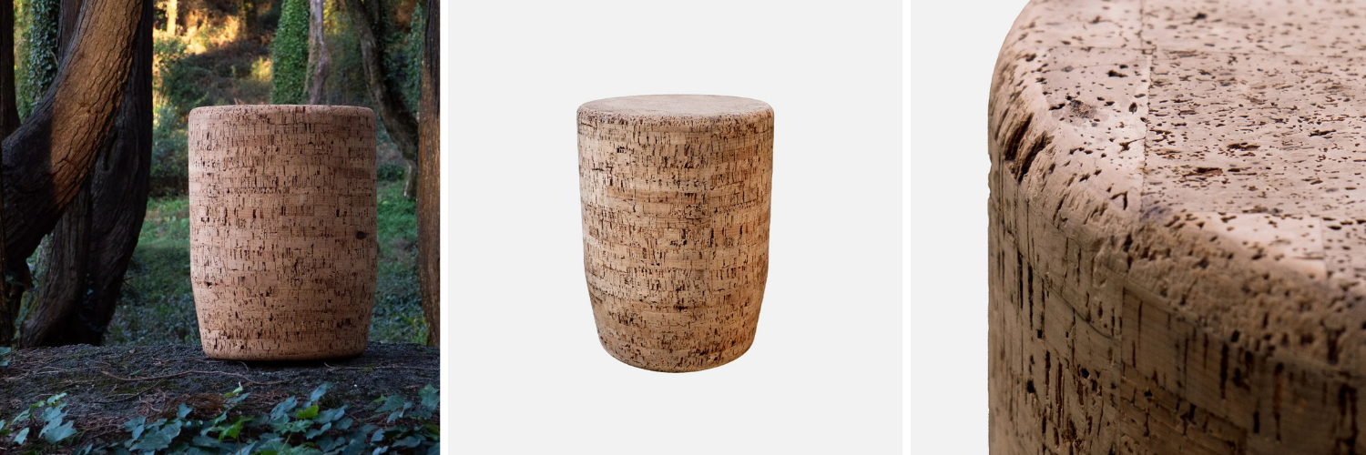 O Banco de Cortiça resulta da ampliação a uma escala de 20 vezes de um modelo de rolha. Sendo fabricado a partir de um bloco maciço de cortiça natural, o seu aspeto visual é diferente do vulgar aglomerado de cortiça. É muito resistente, lavável e tem um envelhecimento bonito. Pode ser usado como banco, mesa de apoio ao sofá ou como mesa de cabeceira.