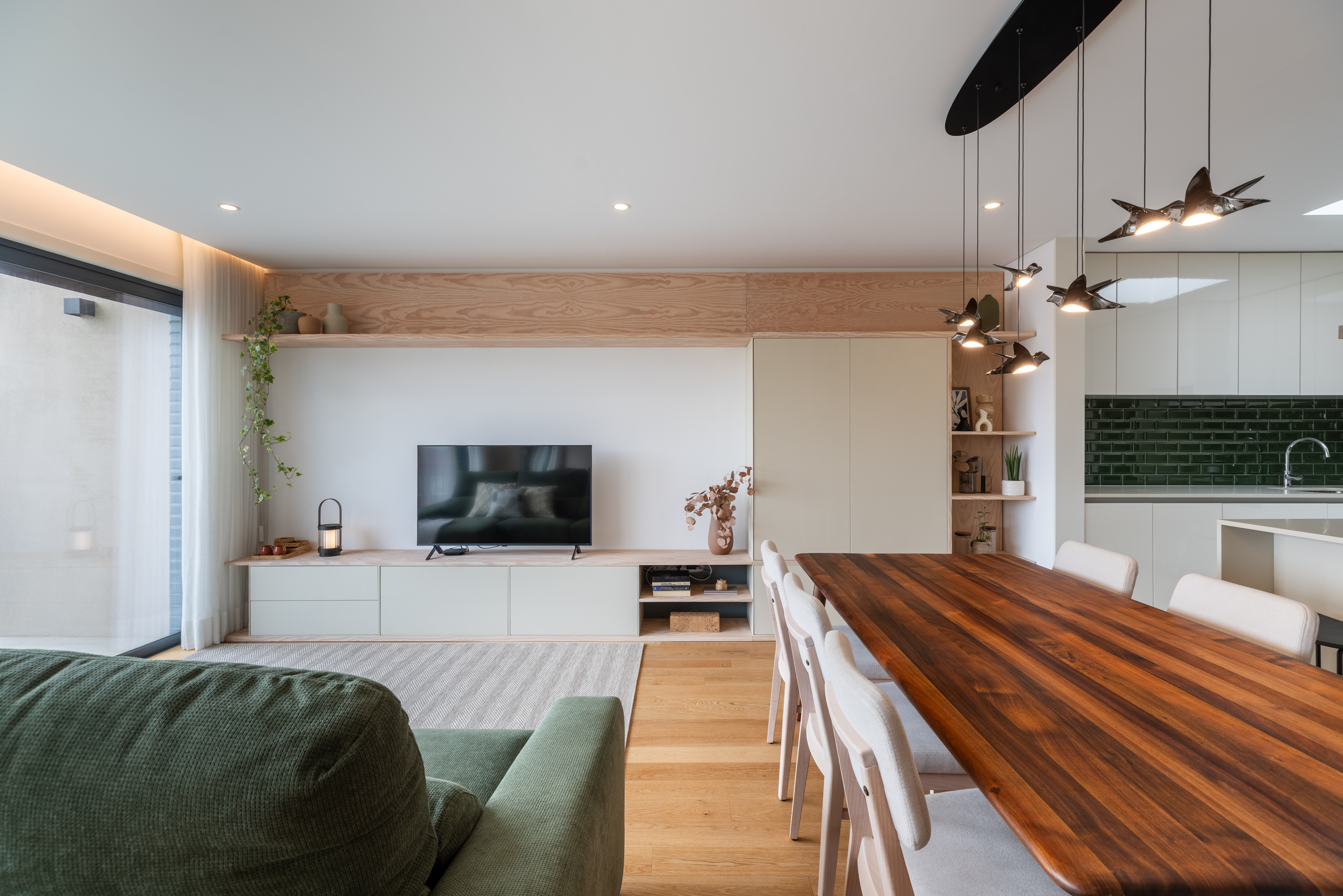 Este projeto recria a atmosfera leve e descontraída de uma casa de férias, onde sala e cozinha se fundem num espaço fluido e aberto. A varanda que envolve a sala reforça a ligação ao exterior, prolongando o convívio para fora. Um elemento divisório assegura a privacidade dos quartos e marca a zona de estar.