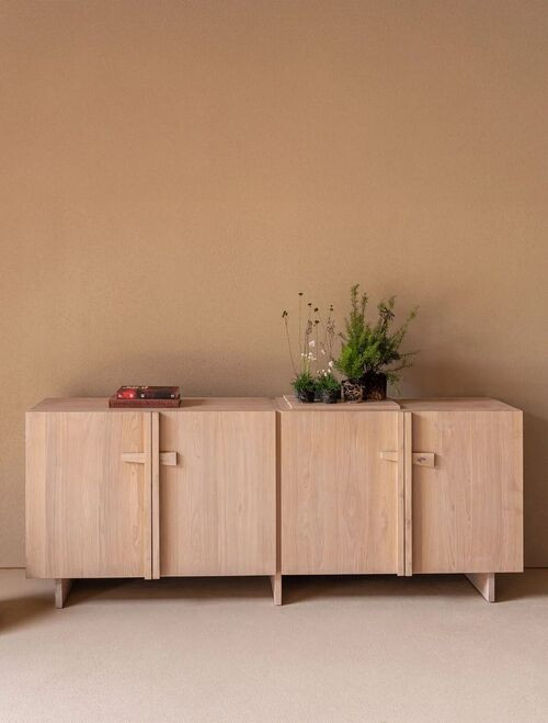 O tampo em aglomerado de pedra natural, é feito, literalmente, de fragmentos de matéria e tempo. A base em madeira maciça é construída com encaixes tradicionais de marcenaria.