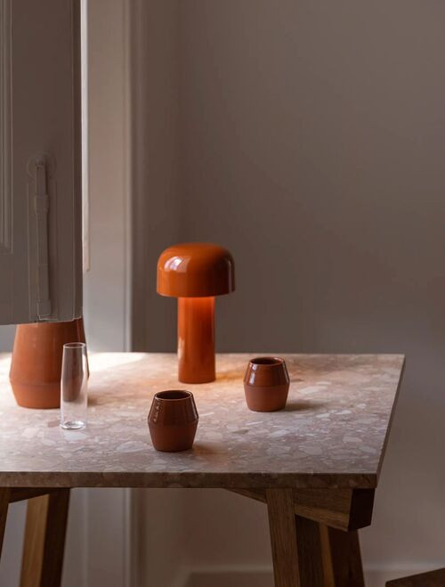 A Mesa Terra lembra-nos um tipo de mesa tradicional portuguesa que se encontrava nas tabernas e cozinhas antigas. Espaços onde muitas gerações se sentaram sem pensar no design da peça. Tampo em pedra, base estável, sem outra ambição além de ser funcional e resistente. Nunca foi tendência, mas faz parte das nossas memórias.